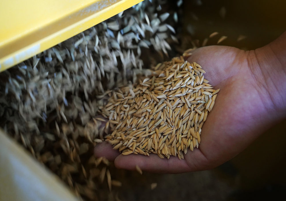 ↑在江西省南昌县大田农社烘干车间,工人展示烘干后的稻谷(10月11日摄)。