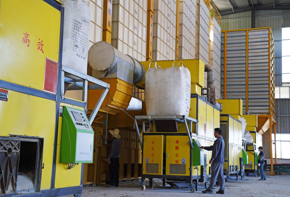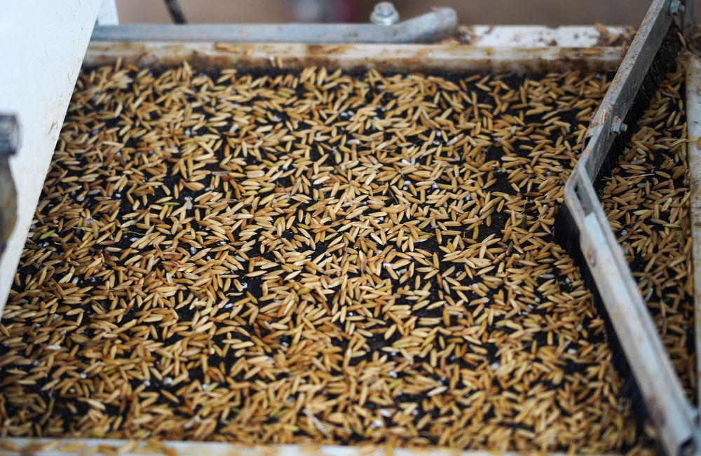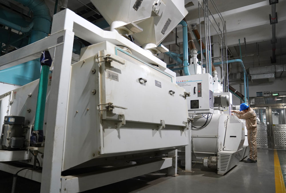 ↑在位于江西省南昌县的一个粮食加工工厂,脱壳机将稻谷脱壳成米(10月11日摄)。