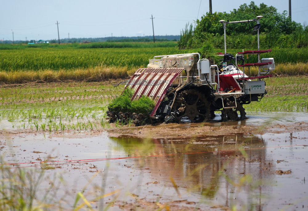 ↑在江西省南昌县大田农社,无人驾驶插秧机在水田里插秧(7月20日摄)。无人驾驶插秧机的运用,减轻了农民的劳动强度,大幅提高了插秧自动化水平和作业效率。
