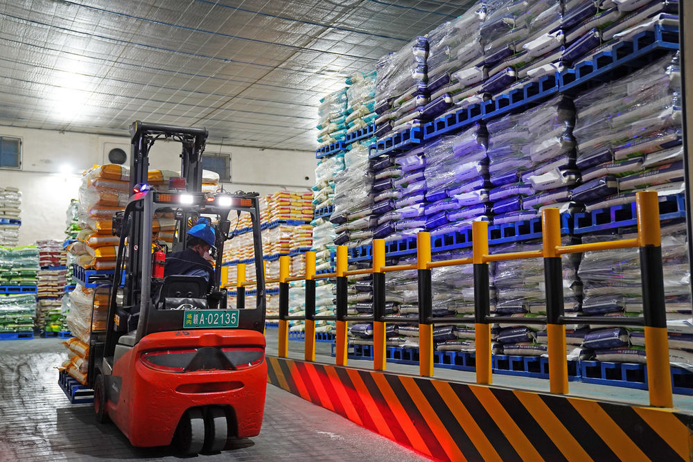 ↑在位于江西省南昌县的一个粮食加工工厂,工人将包装好的大米出库准备运往销售点(10月11日摄)。