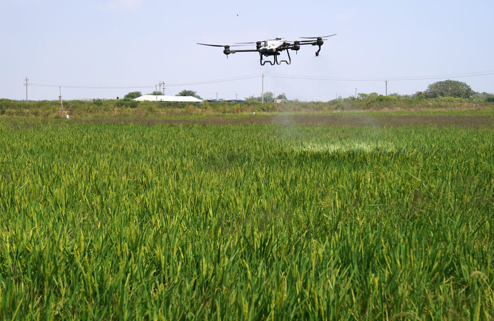 ↑在江西省南昌县大田农社,无人机在给稻田施肥(9月16日摄)。无人机施肥更加高效、精准,缩短了施肥时间,提高了肥料使用率。