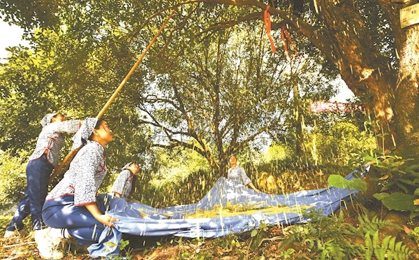 桂花镇柏墩村桂花源,村民正开心打桂花。 (萧颢 摄)