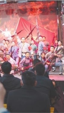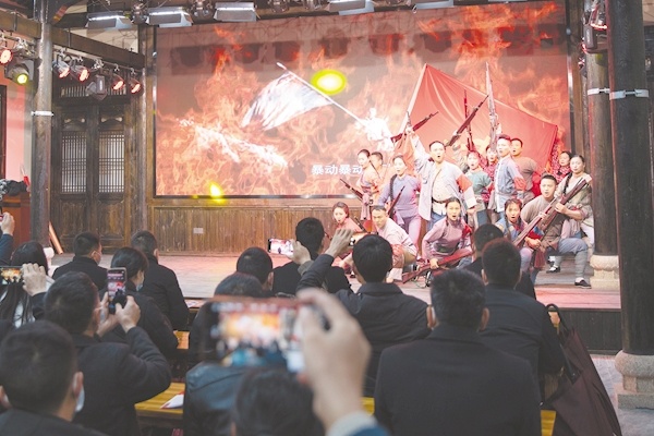 在八一村,游客观看红色情景剧。 (通讯员 汪冠 摄)