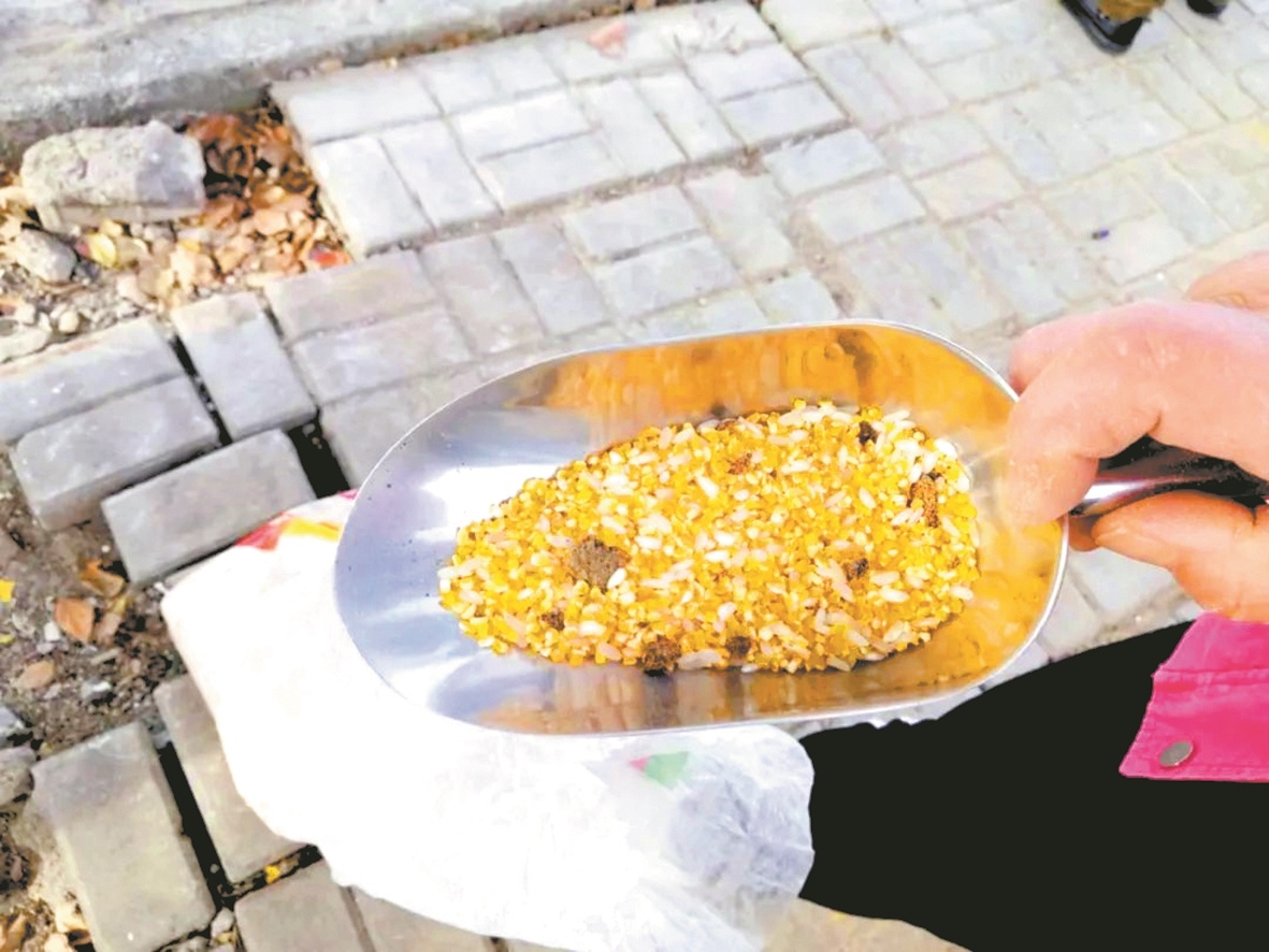 ▲杨建芳撒下鸟食,等着鸟儿们啄食