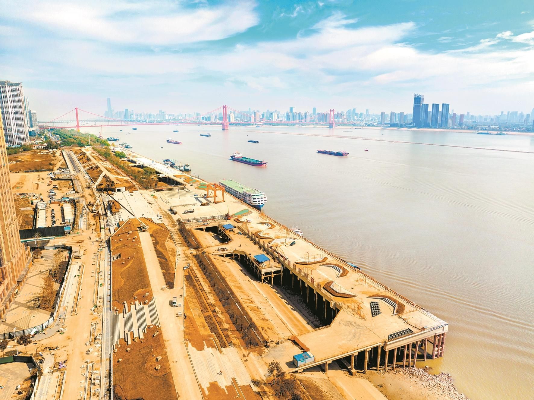 20日,位于武汉汉阳江滩与杨泗港长江大桥连接段的杨泗港都市T台已现雏形,目前正在加速推进景观建设。杨泗港原是滨江工业码头,该都市T台项目是武汉百里长江生态廊道工程中的重要一环,工程堤防全长1974米。