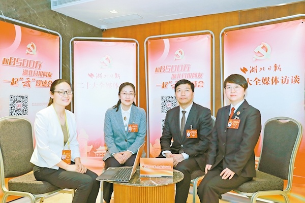 在湖北团驻地访谈间,本报邀请刘亮(右一)、胡超文(右二)、陆小霞(左二)代表参加访谈。 (湖北日报全媒记者 陈迹 摄)