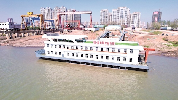 10月中旬,在长江武穴段,长60米的取水泵船停泊在江面上,这是武穴市今年启用的抗旱“利器”——青林提水站工程的核心设施,通过泵船提水将长江水引入武山湖,满足武山湖区农田灌溉需要。