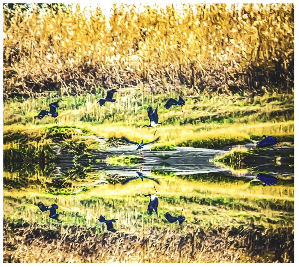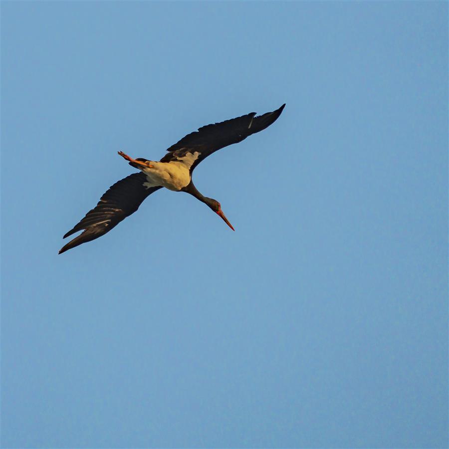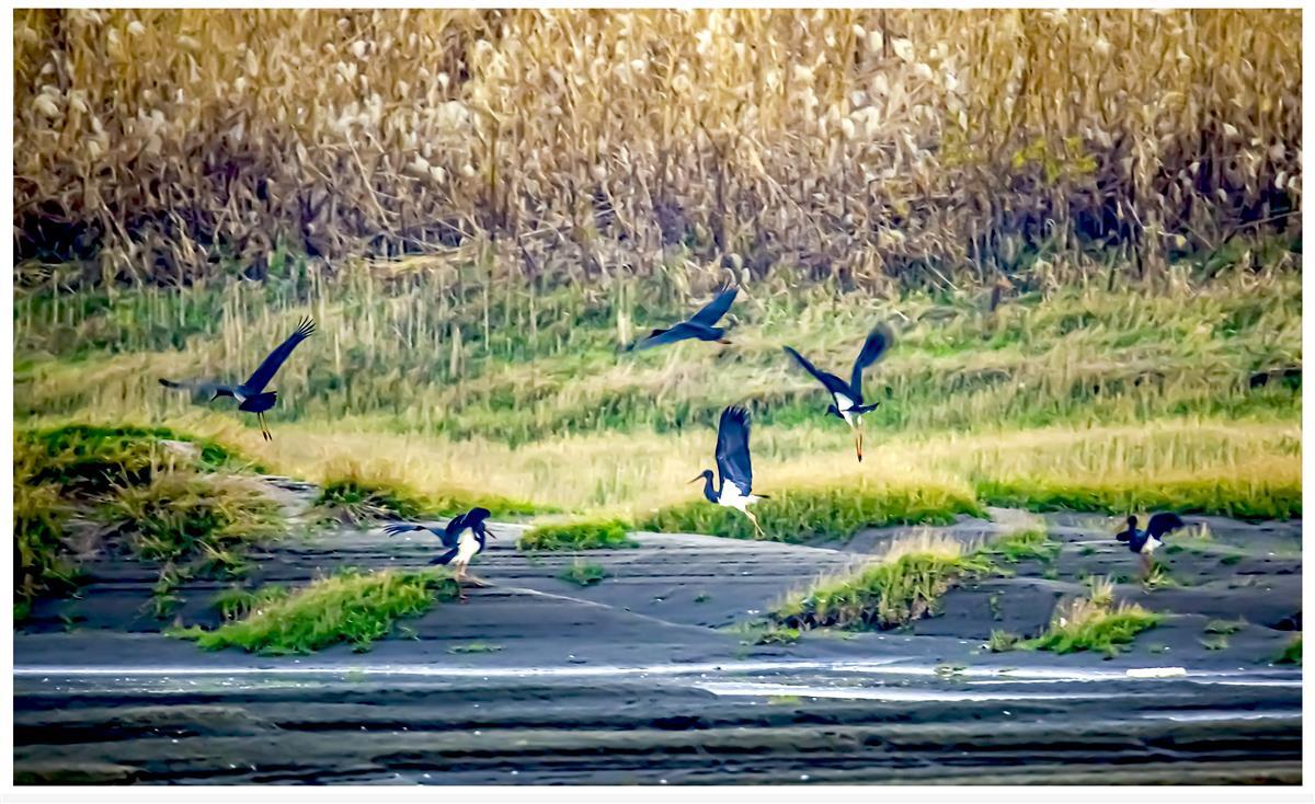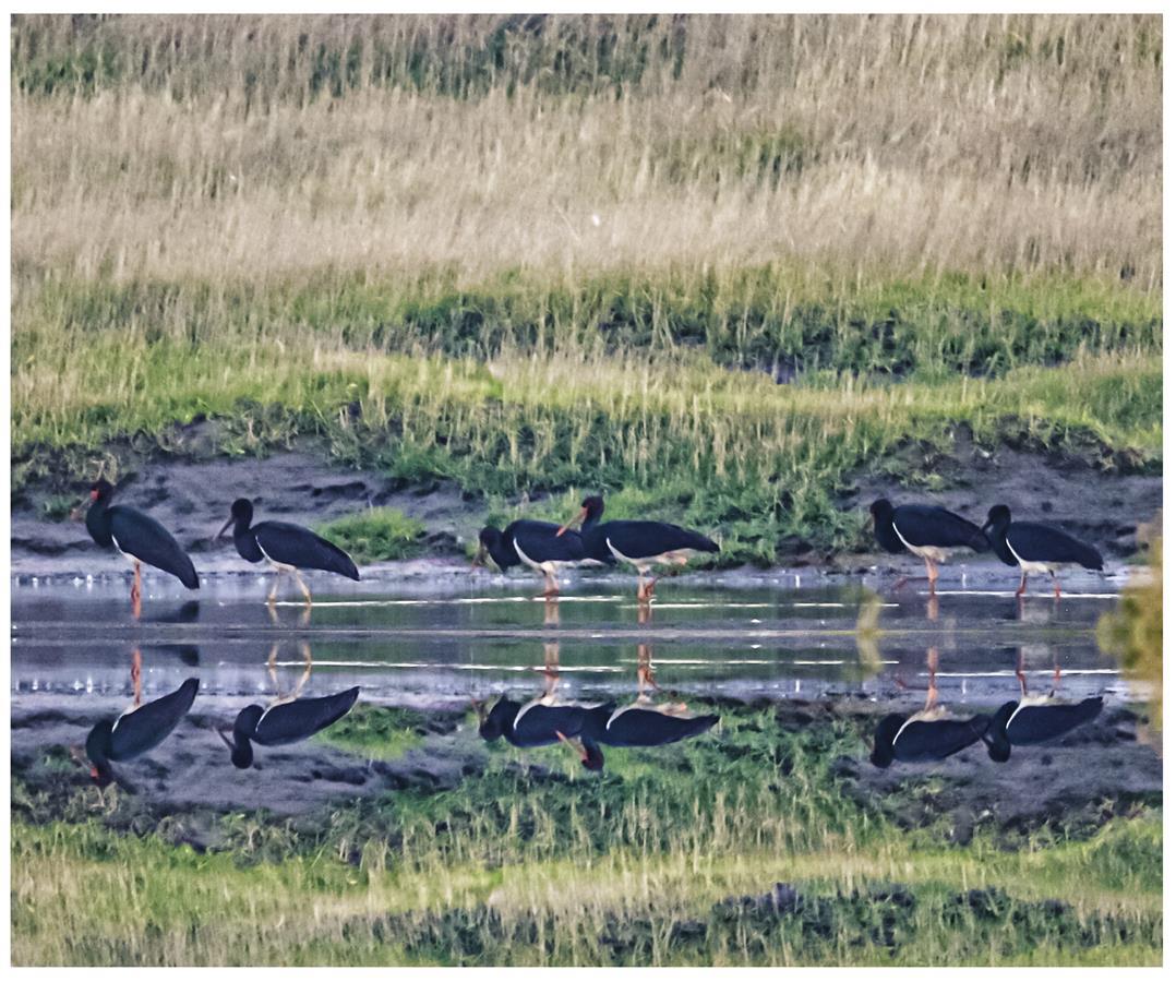 这群大鸟长着长长的、红色的嘴巴和腿脚,羽毛除胸腹部为白色外,其余部分黑得发亮,正是国家一级保护动物黑鹳。