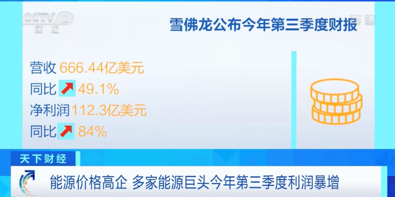 此前一天,壳牌公司发布的第三季度财报显示,壳牌营收达987.59亿美元,同比大增60%,净利润达94.54亿美元,比上年同期的41.3亿美元增加了一倍还多。