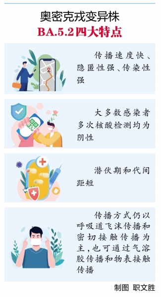 杨小兵指出,通过对现有新冠病毒感染者的流行病学分析,本轮毒株传播呈现四大特点,容易造成感染者数量短时间内快速增长:一是传播速度快、隐匿性强、传染性强。奥密克戎变异株是目前变异程度最深、突变最多的新冠病毒变异体,被世界卫生组织列为关切变异株,从今年1月至今,奥密克戎主导了全球新冠疫情。当前,我国多地流行的毒株均为此变异株。该变异株传播能力较之前的毒株有显著增加。现有证据表明,奥密克戎变异株BA.5.2是目前传播力最强的流行株之一,易造成较大范围传播。