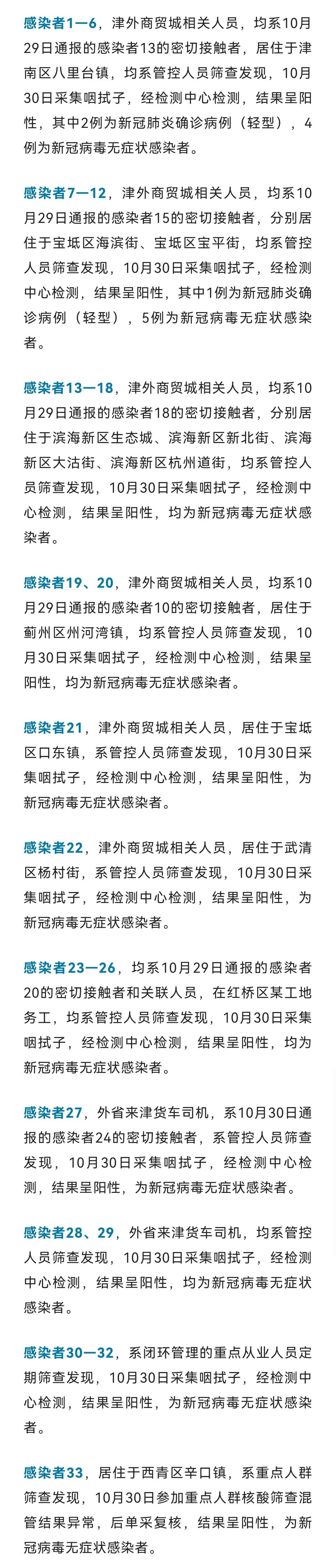 记者从天津市疫情防控指挥部获悉,2022年10月30日0时至24时,天津市疾控部门报告新增33例本土新冠病毒核酸检测阳性感染者,其中,3例为确诊病例(轻型),30例为无症状感染者,详情如下: