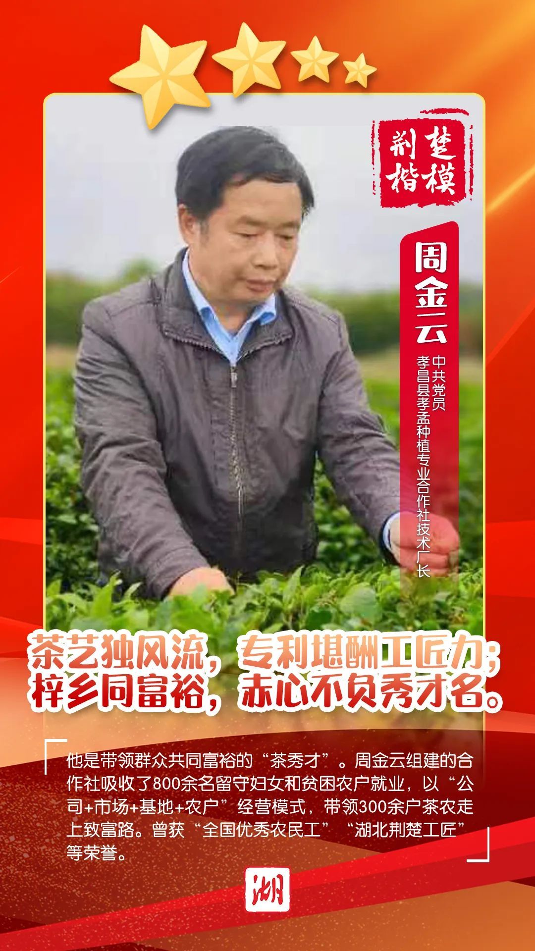 35年来,周金云一次次挑战自己,从“泥瓦匠”到种茶制茶的“土专家”;35年来,他好学不倦,致力科学种制茶叶,获批国家专利10余项;35年来,他是带领群众共同富裕的“茶秀才”,行走于村落间,技术培训近万人,带富茶农400余户、千余人。59岁的他,集“专家”“模范”“巧匠”于一身,是国务院政府特殊津贴专家、湖北省政府专项津贴专家,全国优秀农民工、首届全国阳光创业带头人、全国最美科技工作者、湖北荆楚工匠、湖北省科技特派员,孝感楷模、孝感市劳动模范、孝感五一劳动奖章获得者。