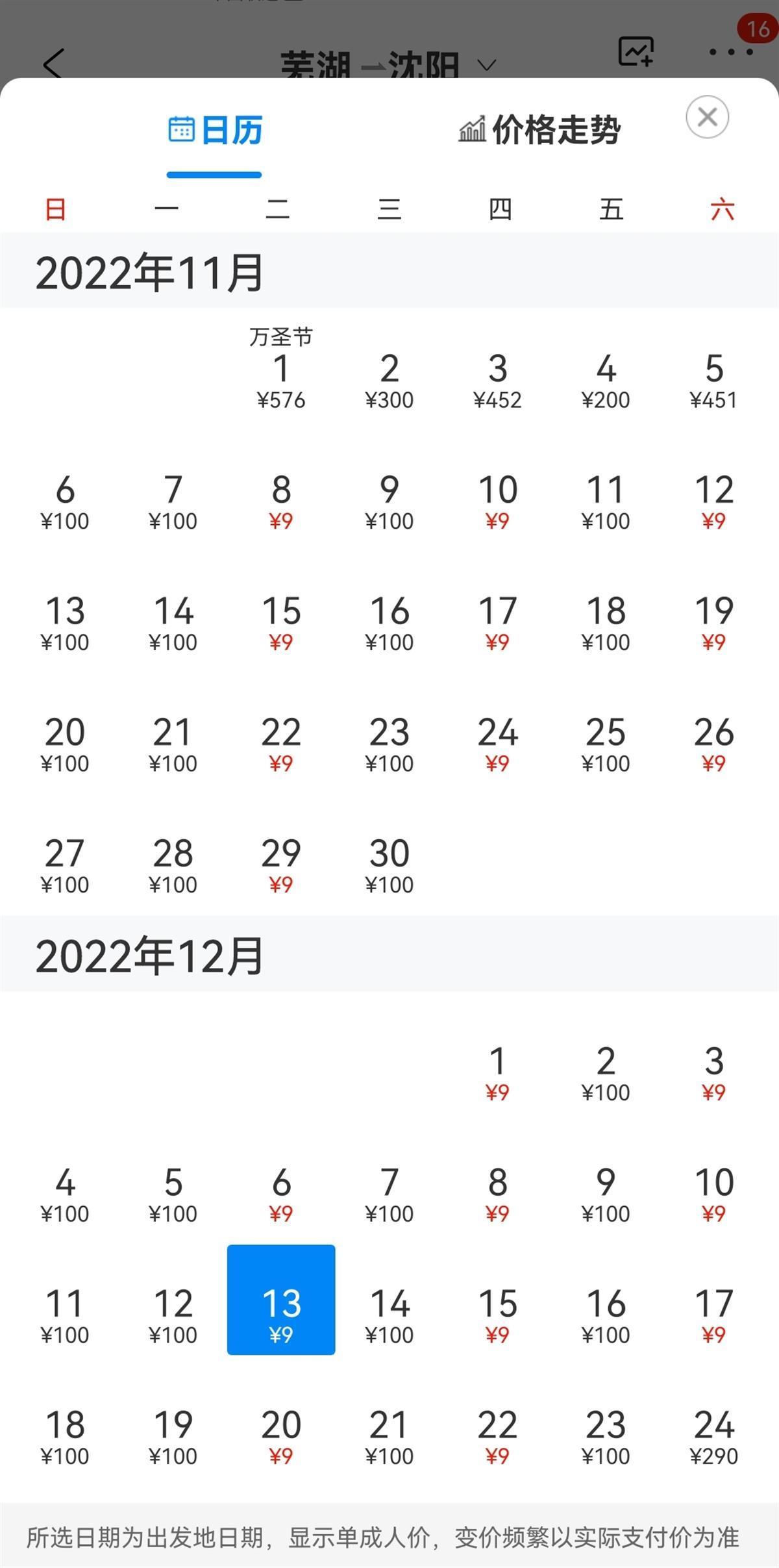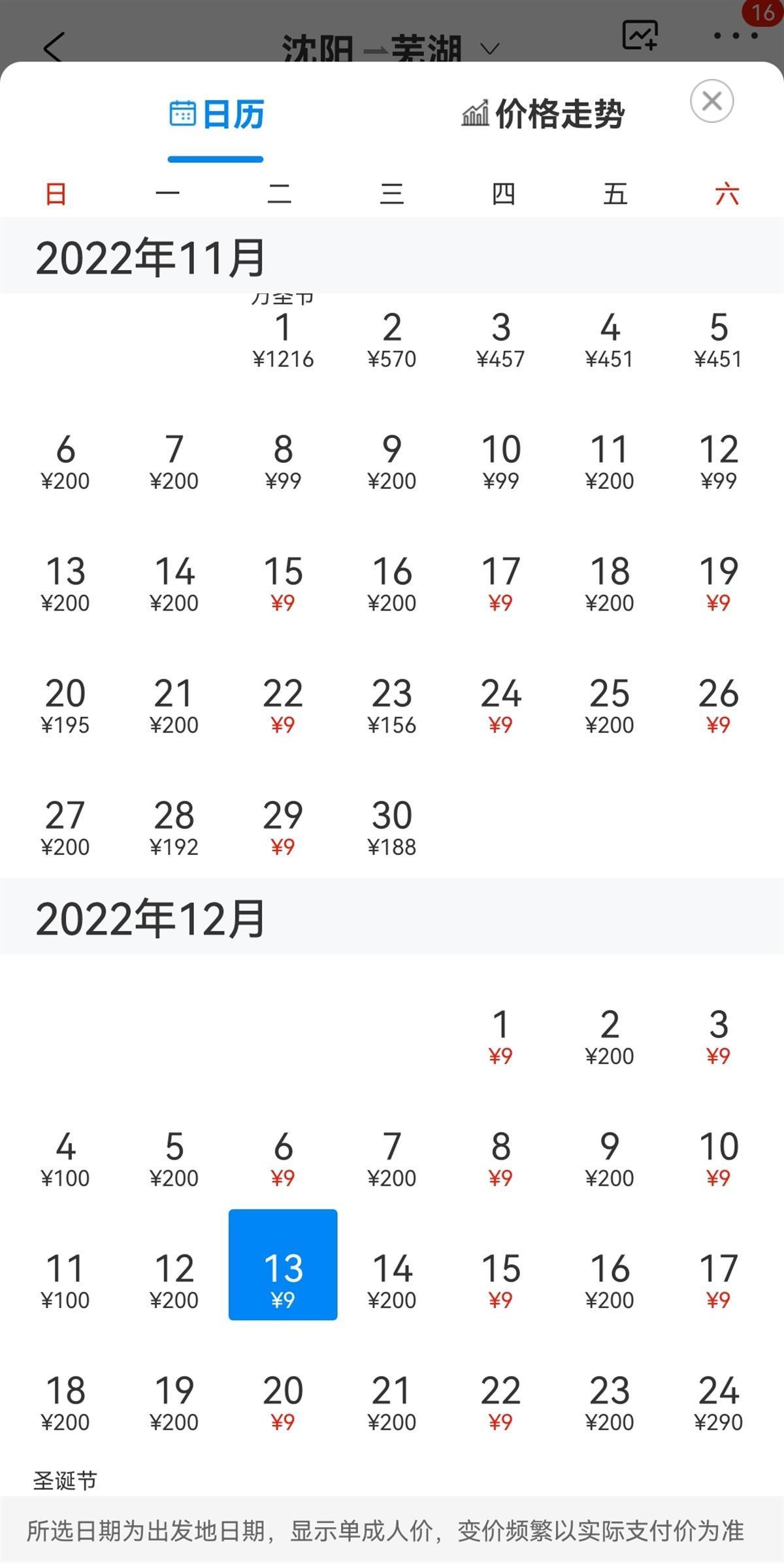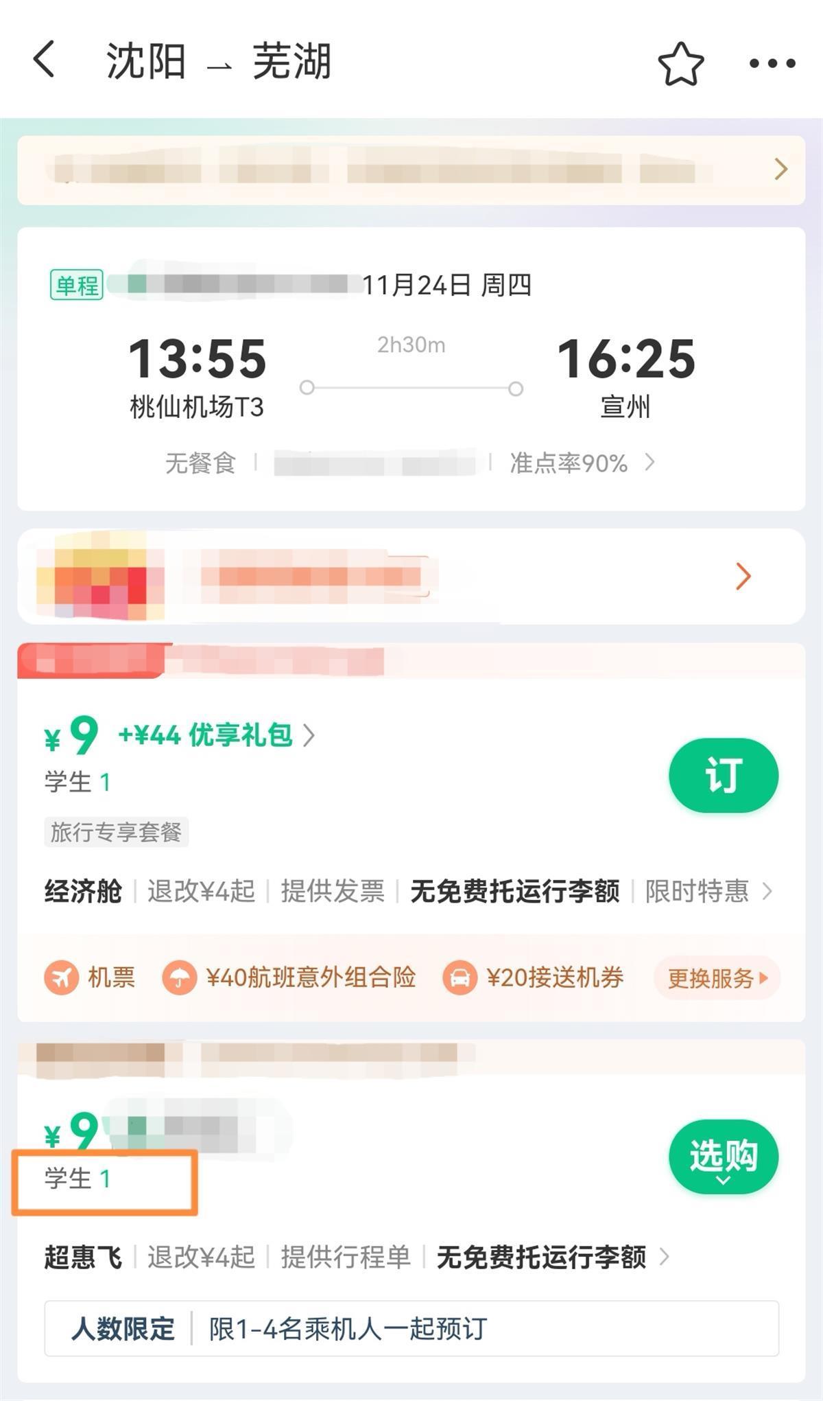 11月1日中午,极目新闻记者在手机上尝试搜索沈阳飞往芜湖的机票,发现11月22日、24日、26日某航班的直达机票价格显示为9元,时间集中在每周的周二、周四、周六,一直持续到12月份,同时从芜湖飞往沈阳的机票也显示为9元。记者用了多个常用的第三方购票平台搜索,其中有一家平台显示在9元的价格上还有优惠,当旅客完成学生认证后,票价低至1元。
