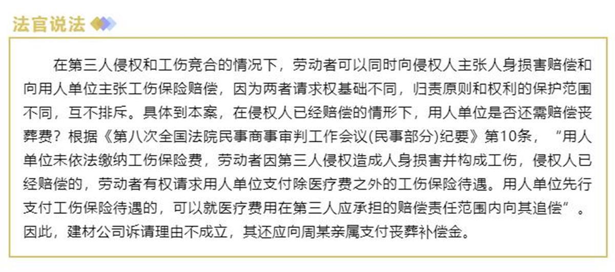 那么,劳动者因工伤亡,在获得商业保险赔偿后还可以主张工伤保险待遇吗?办案法官介绍,在第三人侵权和工伤竞合的情况下,劳动者可以同时向侵权人主张人身损害赔偿和向用人单位主张工伤保险赔偿,因为两者请求权基础不同,归责原则和权利的保护范围不同,互不排斥。根据相关法律规定,建材公司诉请理由不成立,其还应向周某亲属支付丧葬补偿金。