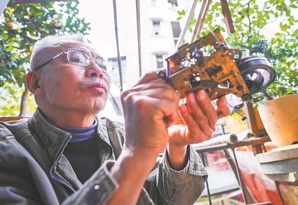 拆卸机芯、洗油、上发条、提升重锤、修补雕花……这些产自美国、德国、法国、瑞士、日本等地的古董钟,在曹庆吉手中一一“复活”。据不完全统计,38年来,他修复的钟多达500余座,他家中也收藏了近300座古董钟。
