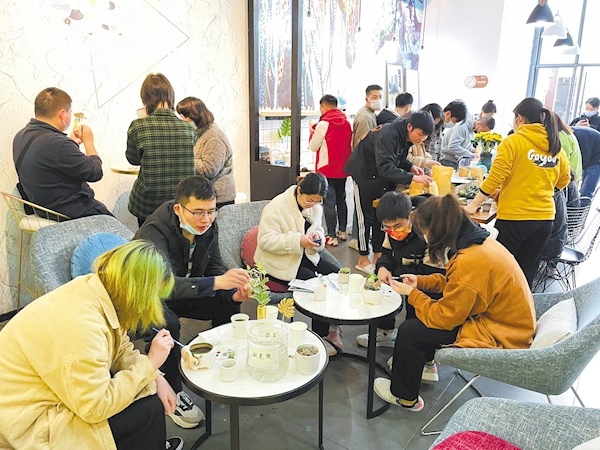 冠寓一楼共享大厅,入住的年轻人参加绿植主题的团建活动。
