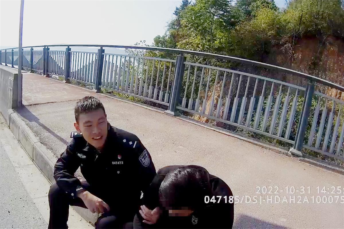 10月31日,十堰市郧阳区汉江三桥出现惊险一幕。身高1米9的郧阳民警颜锐隔着护栏,将一名已站在护栏外的男子从背后环抱,3分钟后增援民警赶至现场,协力将男子拉到安全地带。