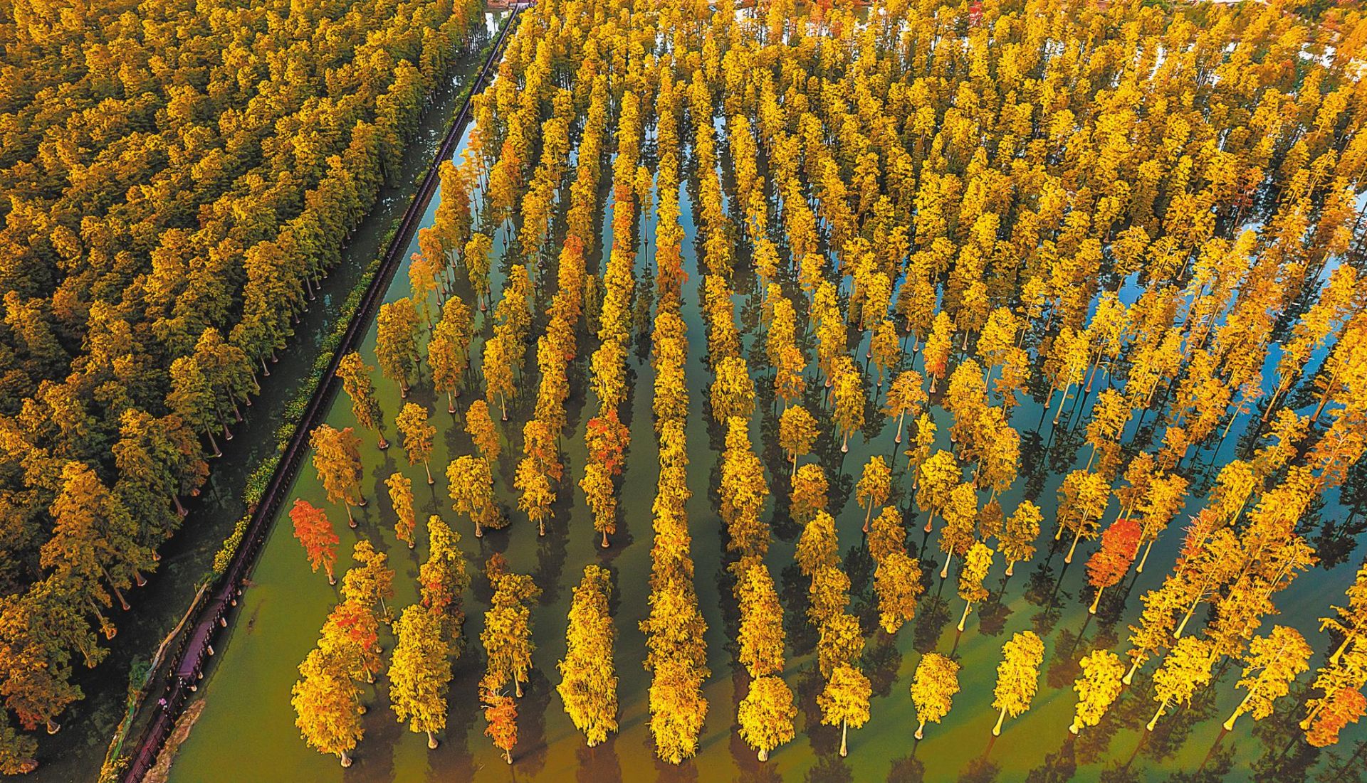11月2日,武汉涨渡湖湿地数千棵水杉树林中鹭鸟翔集,吸引许多市民游客前来捕捉秋色美景。 (湖北日报全媒记者 朱熙勇 摄)