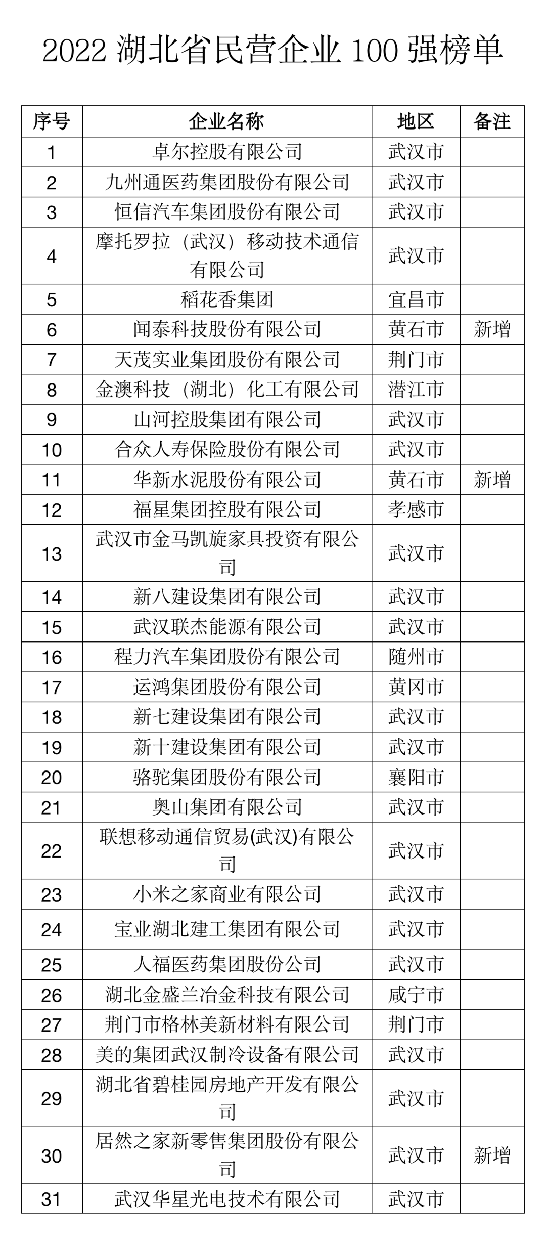 2022湖北民营企业100强榜单