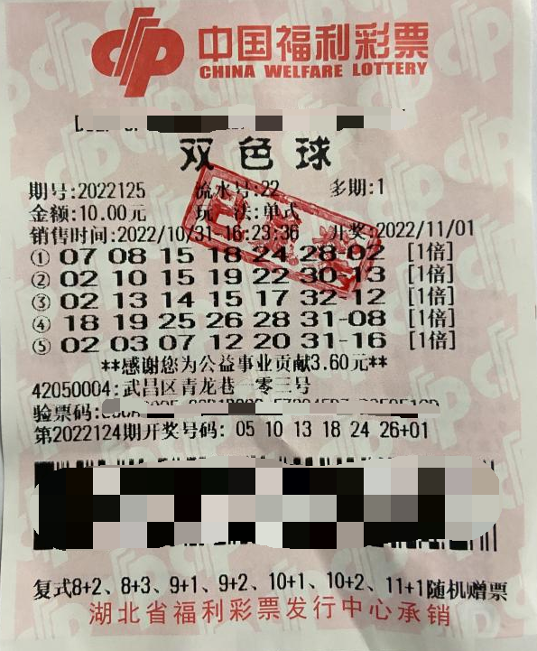 11月1日晚,福彩双色球第2022125期开奖。当期全国开出7注一等奖,单注奖金为796万元。武汉市武昌区一购彩者,凭借一张10元机选票,幸运收获其中一注。