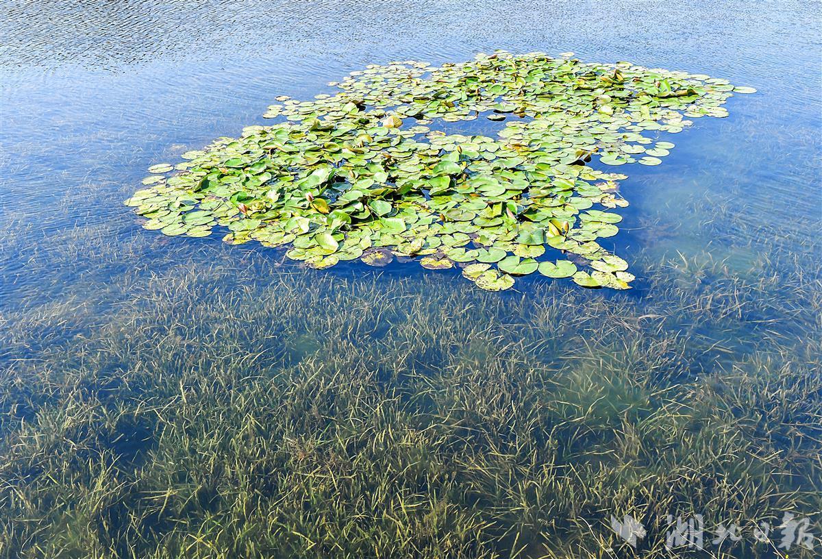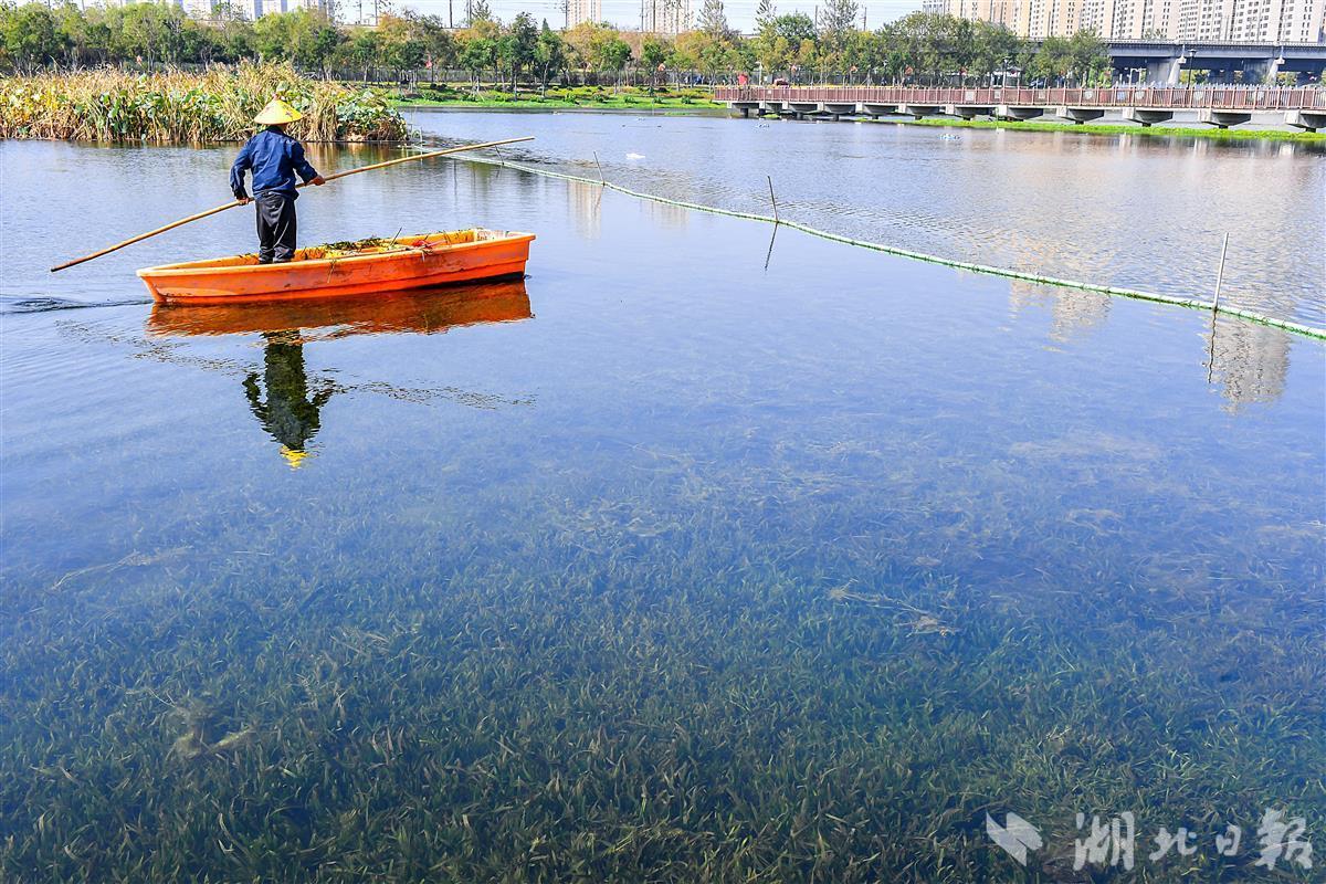 10月31日,武汉杨春湖的湖水清澈如镜,湖底水草茂密如林,一名湖泊守护者正划着船在打捞水中垃圾和杂草。