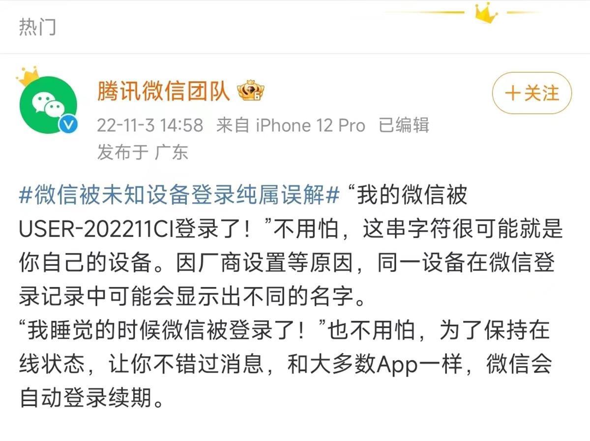 对于微信显示被陌生ID(如USER-202211CI)登录的问题,腾讯微信团队解释称,不用怕,这串字符很可能就是你自己的设备。因厂商设置等原因,同一设备在微信登录记录中可能会显示出不同的名字。