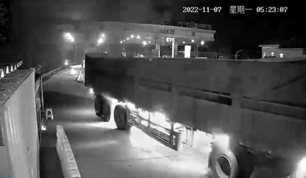 11月7日凌晨5点20分,司机高师傅驾驶一辆大型货车从湖北交投襄阳运营公司安居收费站混合车道缓缓驶出时,阵阵浓烟夹杂着刺鼻的焦糊味、轮胎下窜起的火苗和地上掉落的火焰引起了出口收费员邱洋溢的警觉。她的第一反应是:车子着火了!