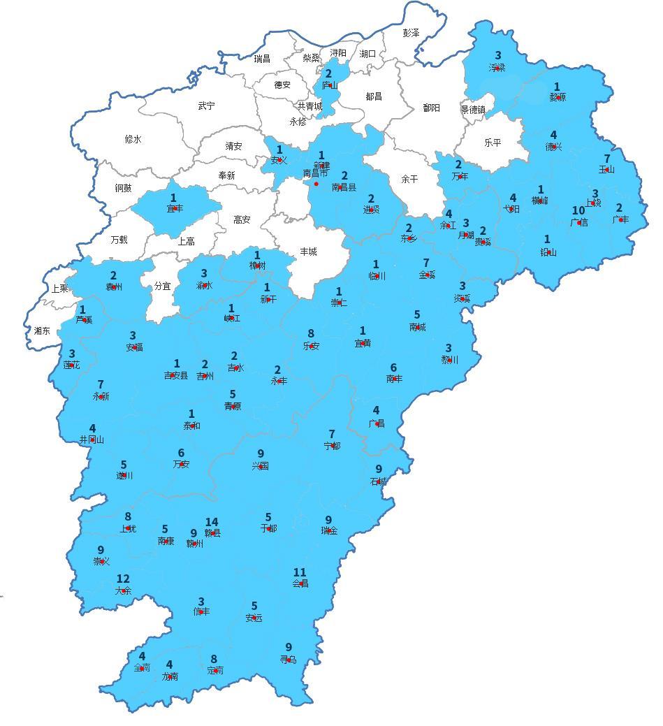 11月1—6日,受台风外围环流、低层切变和弱冷空气共同影响,江西大部分地区出现弱降水天气。为应对全省严峻旱情,江西抢抓时机,实施了大规模立体化空地联合作业。人工增雨作业次数分布图显示,蓝色覆盖的为已开展作业的区域,赣中赣南地区旱情在一定程度上得到缓解,范围包含粮食生产大县和蔬菜生产大县。