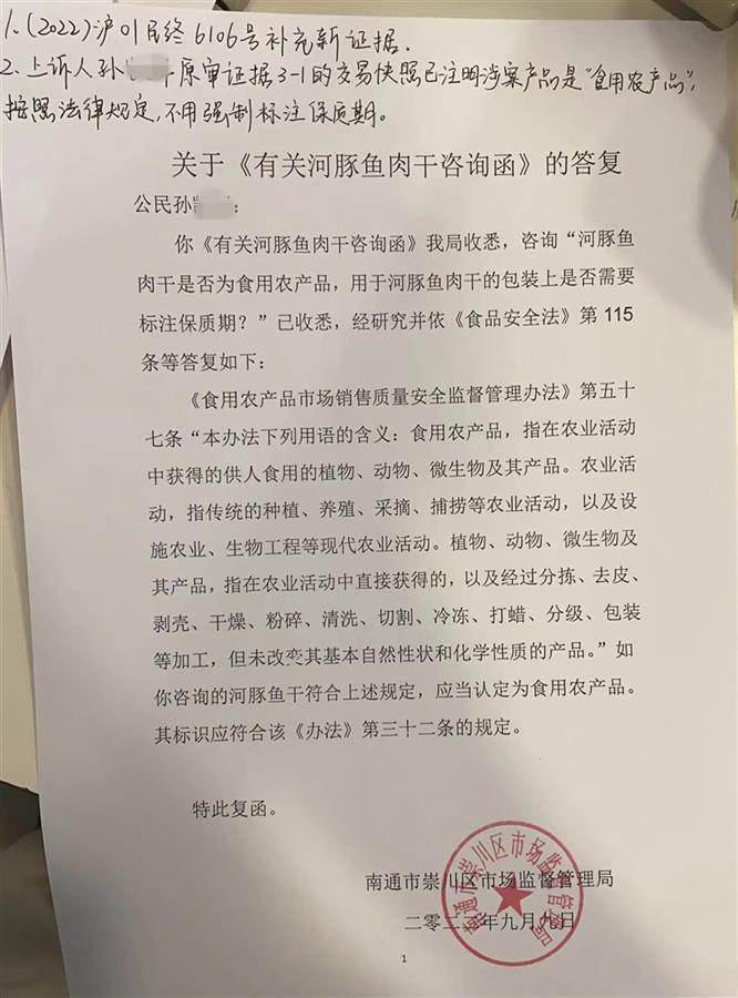 今年9月,南通市崇川区市场监督管理局向孙先生出具的答复函中称,河豚鱼干应该属于食用农产品。