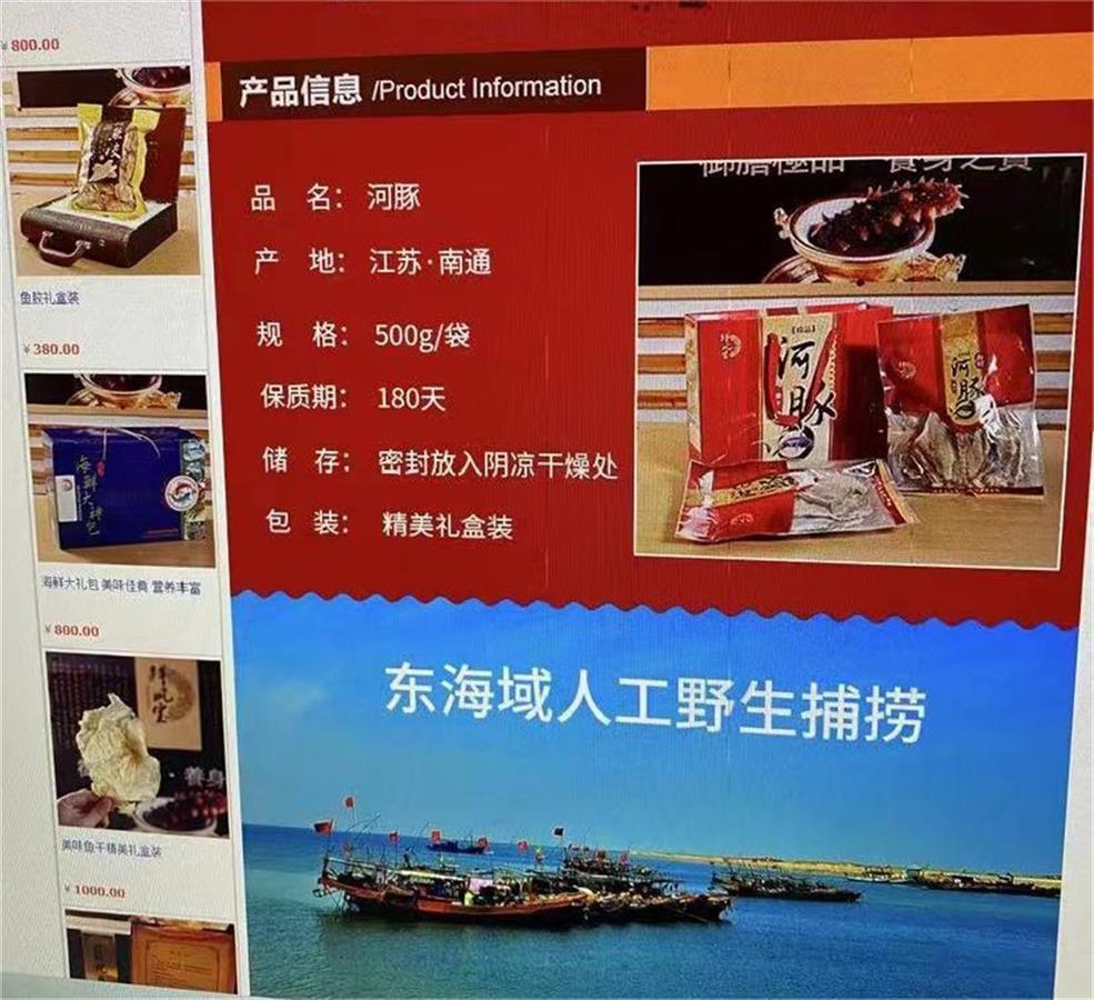 孙女士介绍,她来自江苏南通。因为当地靠近长江和大海,用淡水和海水养殖河豚(亦称河鲀)已形成产业,许多餐馆的菜单上也有河豚。前几年,还在上学的孙女士用父亲的个体户营业执照注册了网店,出售各种河鲜、海鲜,其中包括河豚鱼干。