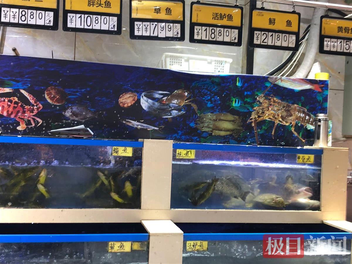 11月8日,江城天气晴好,在汉口后湖南路的露天街边生鲜市场里,几家水产门店前多个水槽里满是待售的淡水鱼,看上去货源十分充足。