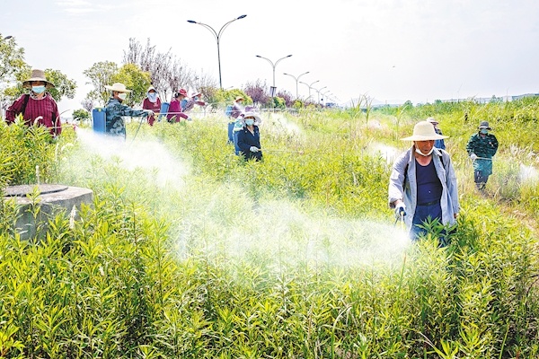 30多名“围剿”队员在洪山区通用园区北路喷洒除草剂,围剿“一支黄花”。 (本文图片均由湖北日报全媒记者 朱熙勇 摄)