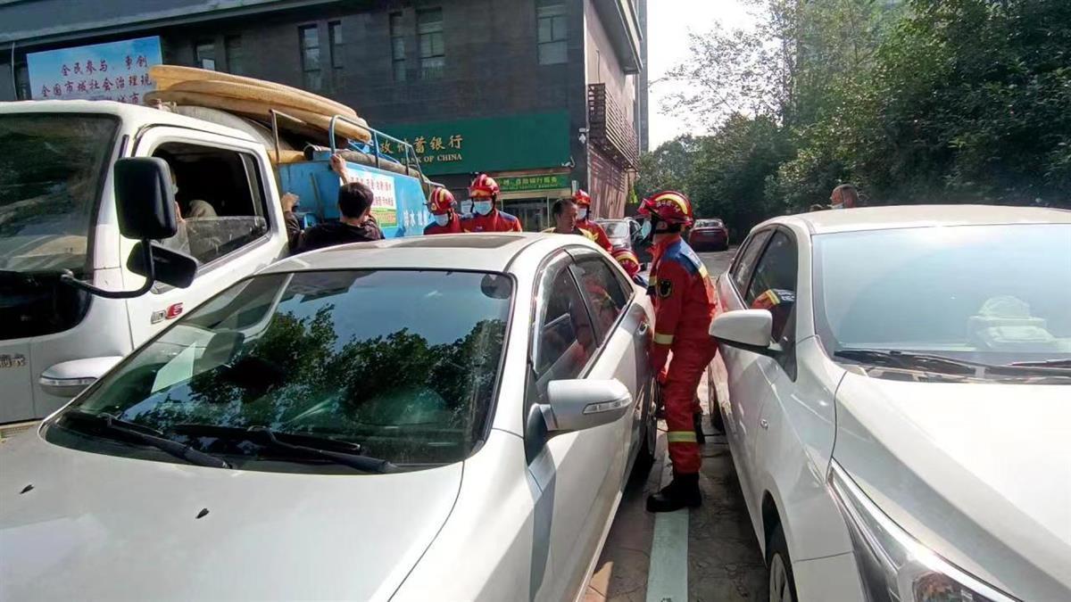 接警后,琵琶山路消防救援站立即出动2车14名消防救援人员赶赴现场处置。到达现场后,消防救援人员发现一人被困在市政排水抢修车与一辆私家车之间,被困人员为排水抢修车司机,其腿部挤在驾驶室外无法动弹但意识清晰。