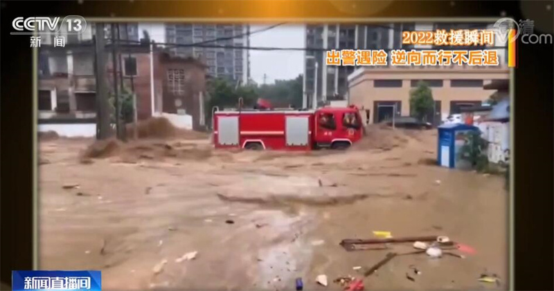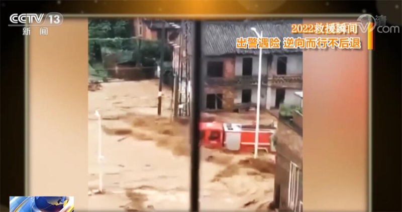 奔涌的山洪将消防车困在水中,巨大的冲力把16.5吨重的车身推得连连后退。失去了动力,一车人随时可能被激流卷走。