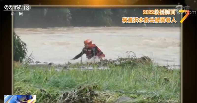 湍急的洪水将成片的竹林拦腰折断,这名消防员却准备只身横渡。对岸的村庄里两名老人正在等待救援。