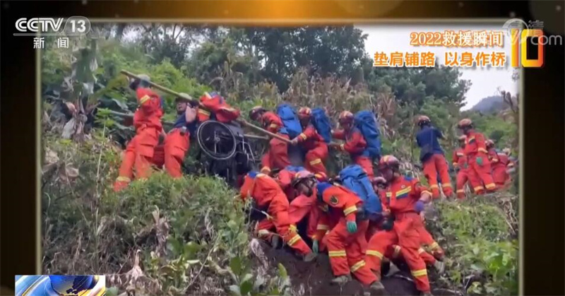 这一幕发生在震后的石棉,滚落的山石阻断了山路,消防员的任务是要将困在村里的瘫痪老人转移下山。当行至滑坡路段时,路面已无法行走,2名消防员便率先跳下去,用自己的肩膀和后背垫在坍塌处,让队员踩着通过。
