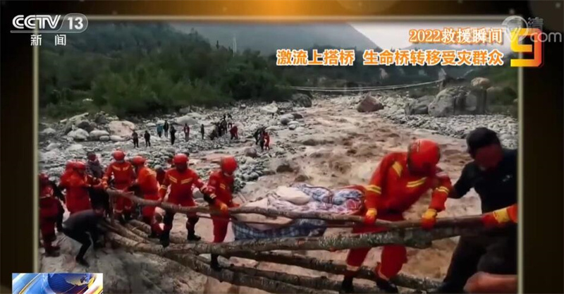 地震后,村子通往外界的唯一通道被毁,转移被困村民刻不容缓!在这条近百米宽的河道上,森林消防员用一根根树桩搭起了两座简易木桥。