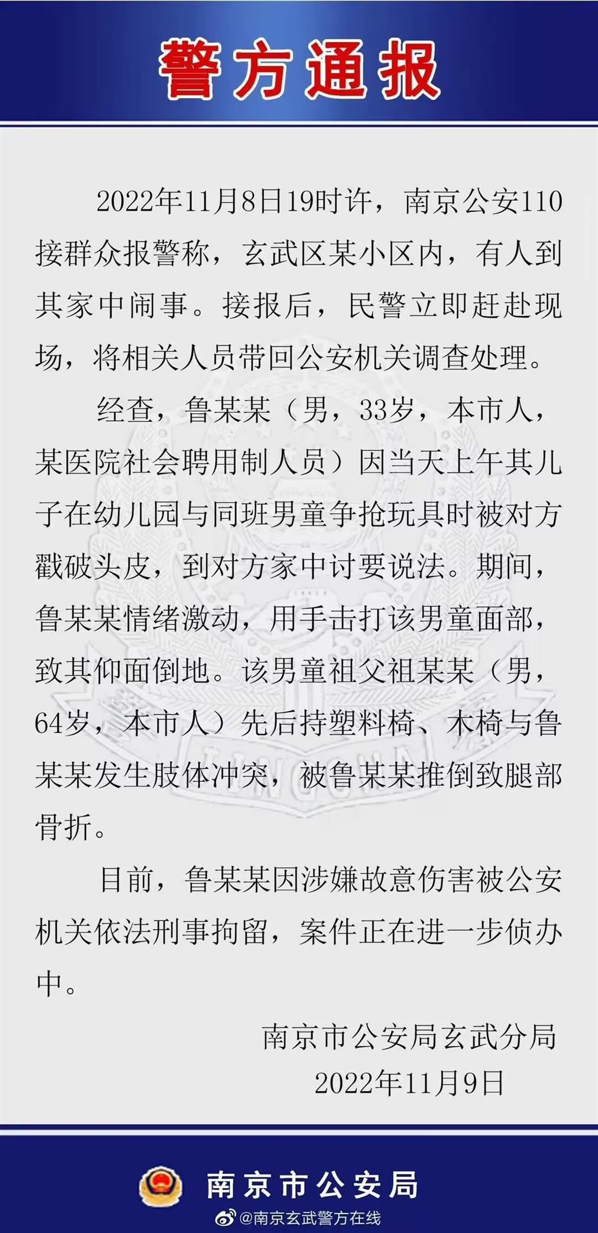11月9日下午5时许,南京市公安局玄武区分局发布警情通报称,11月8日19时许,南京公安110接群众报警称,玄武区某小区内,有人到其家中闹事。接报后,民警立即赶赴现场,将相关人员带回公安机关调查处理。经查,33岁的某医院社会聘用制人员鲁某某,因当天上午其儿子在幼儿园与同班男童争抢玩具时被对方戳破头皮,到对方家中讨要说法。期间,鲁某某情绪激动,用手击打该男童面部,致其仰面倒地。该男童祖父64岁的祖某某先后持塑料椅、木椅与鲁某某发生肢体冲突,被鲁某某推倒致腿部骨折。目前,鲁某某因涉嫌故意伤害被公安机关依法刑事拘留,案件正在进一步侦办中。