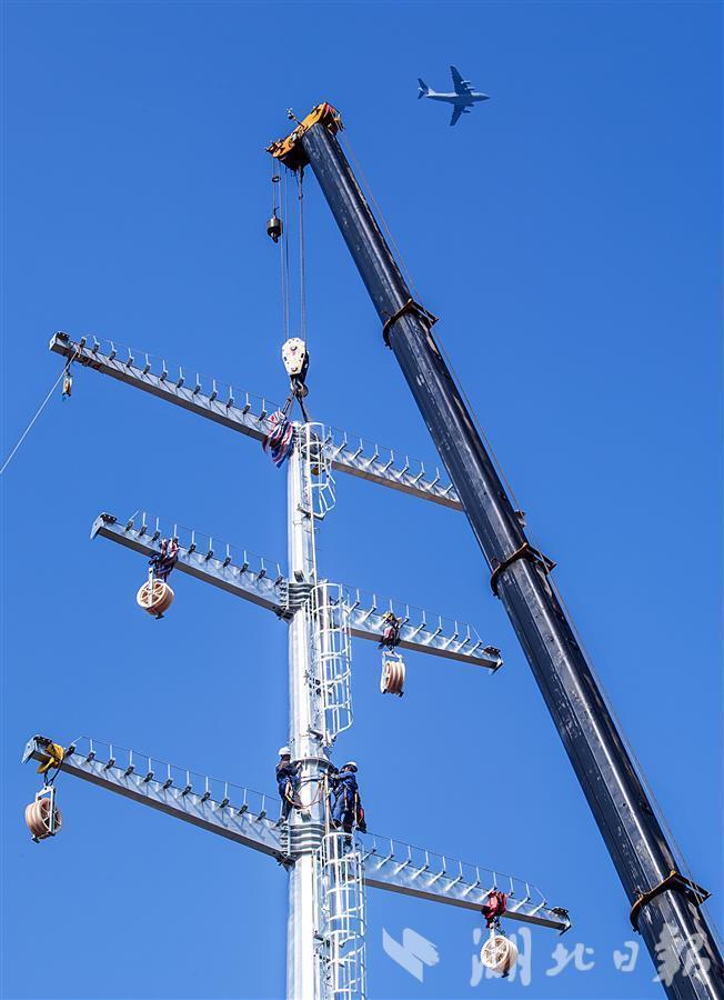 11月10日,在武汉江夏区藏龙岛的藏龙大道路边,施工人员正在安装供电塔,一架飞机从塔顶上飞过。