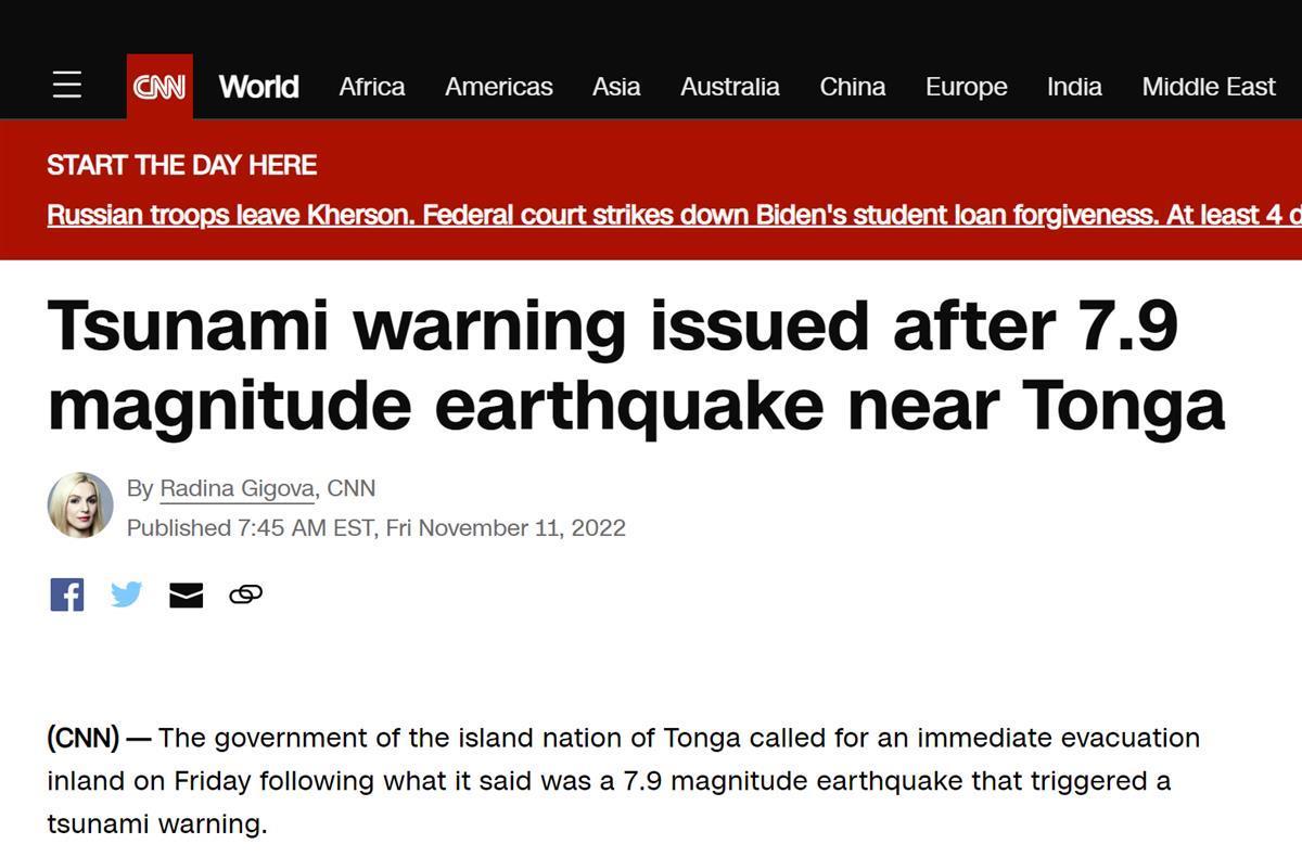 据CNN11月11日报道,当地时间11月11日,南太平洋岛国汤加附近海域发生7.9级地震,引发海啸警报,政府呼吁人们立即向内陆疏散。
