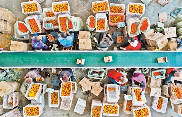 连日来,枝江市桔缘柑桔专业合作社180余名工人忙着对柑橘进行分级、包装、封箱,以满足电商订单需求。 柑橘是枝江农业主导产业之一,该市今年克服旱情影响,预计柑橘总产量达77万吨,产值84亿元。(湖北日报全媒记者 刘曙松 通讯员 毛晓娜 摄)