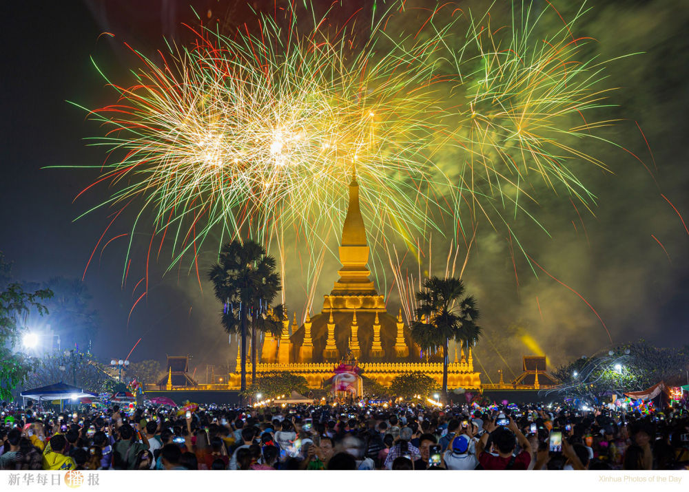 这是11月8日在老挝首都万象拍摄的塔銮上空的烟花表演。塔銮节是老挝规模最大、场面最隆重的传统宗教节日,在每年佛历12月(公历10、11月间)举行。2022年的塔銮节从11月6日持续到8日。塔銮是老挝最著名的佛塔,塔身高大雄伟,金碧辉煌。