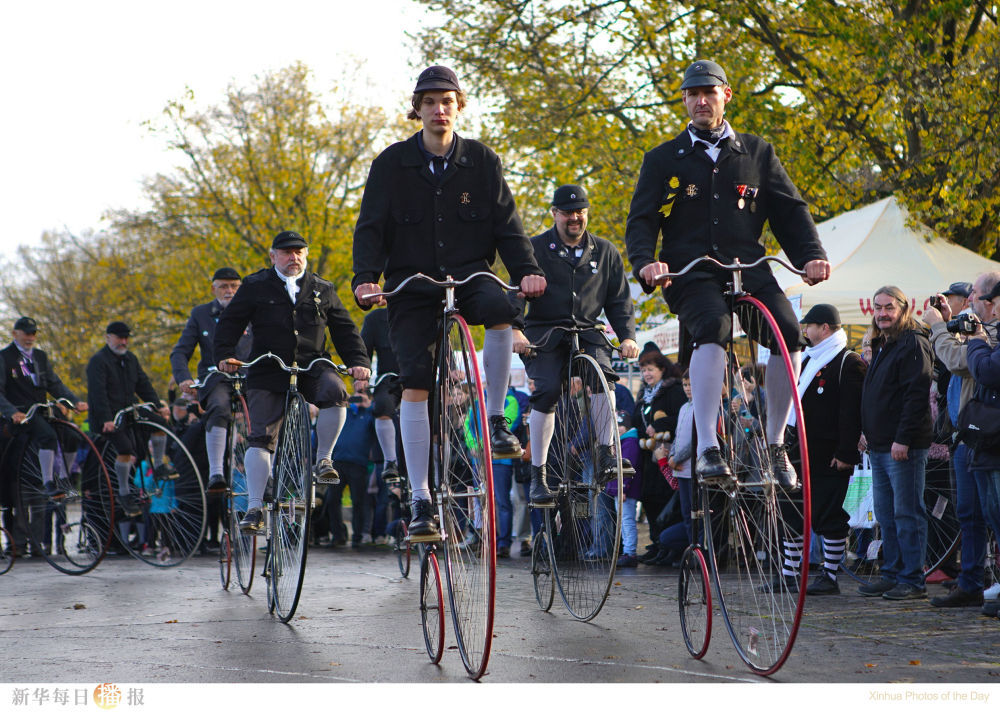 11月5日,参赛者在捷克首都布拉格参加传统高轮自行车比赛。