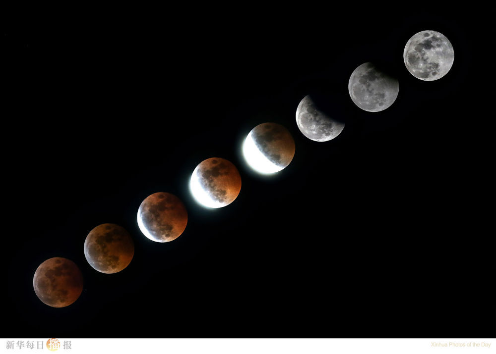 这是11月8日晚在菲律宾奎松城拍摄的月食景象(合成照片)。11月8日晚,今年第二场月全食在天宇上演。