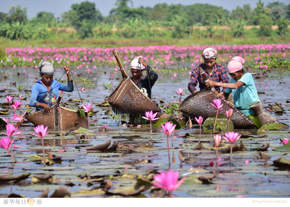 11月6日,几名女子在印度阿萨姆邦的湖中捕鱼。
