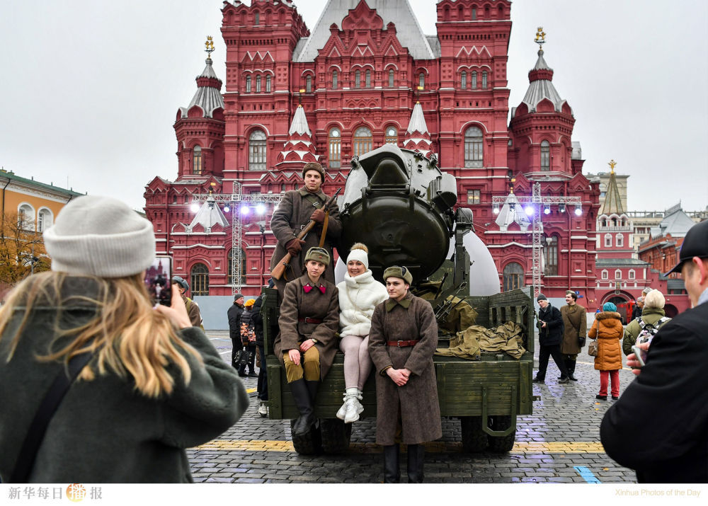 11月7日,在俄罗斯首都莫斯科,人们在以纪念1941年苏联红场阅兵式为主题的露天展览上拍照。当日,俄罗斯在红场举行露天展览,纪念1941年苏联红场阅兵式。