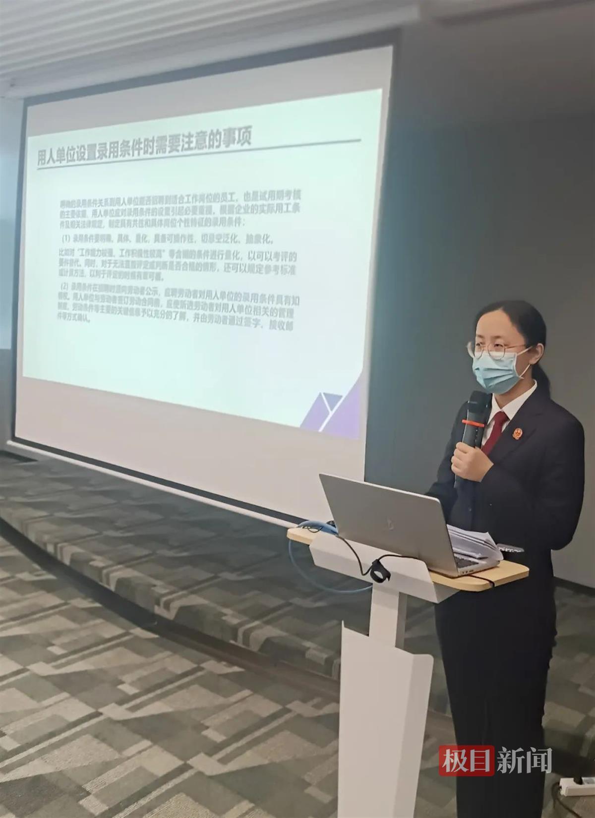 活动现场,人工智能科技园70余家企业代表参加了法律知识培训讲座。产业经济巡回法庭法官张慧莲以“常见劳动争议问题”为主题,从劳动关系的建立、履行、解除、特殊员工管理等5个方面,深入浅出地讲解了企业营运过程中可能存在的各类经营风险,积极科普相关法条和维权渠道,提醒务工人员合法有效维护自身权益。在互动交流环节,部分企业代表就如何认定工资标准、规章制度如何公示等问题踊跃提问,同时结合热播法治电视剧《底线》分别谈了对法院工作的认识和感受。为此,张慧莲一一进行了耐心解答和回应,现场气氛十分热烈。