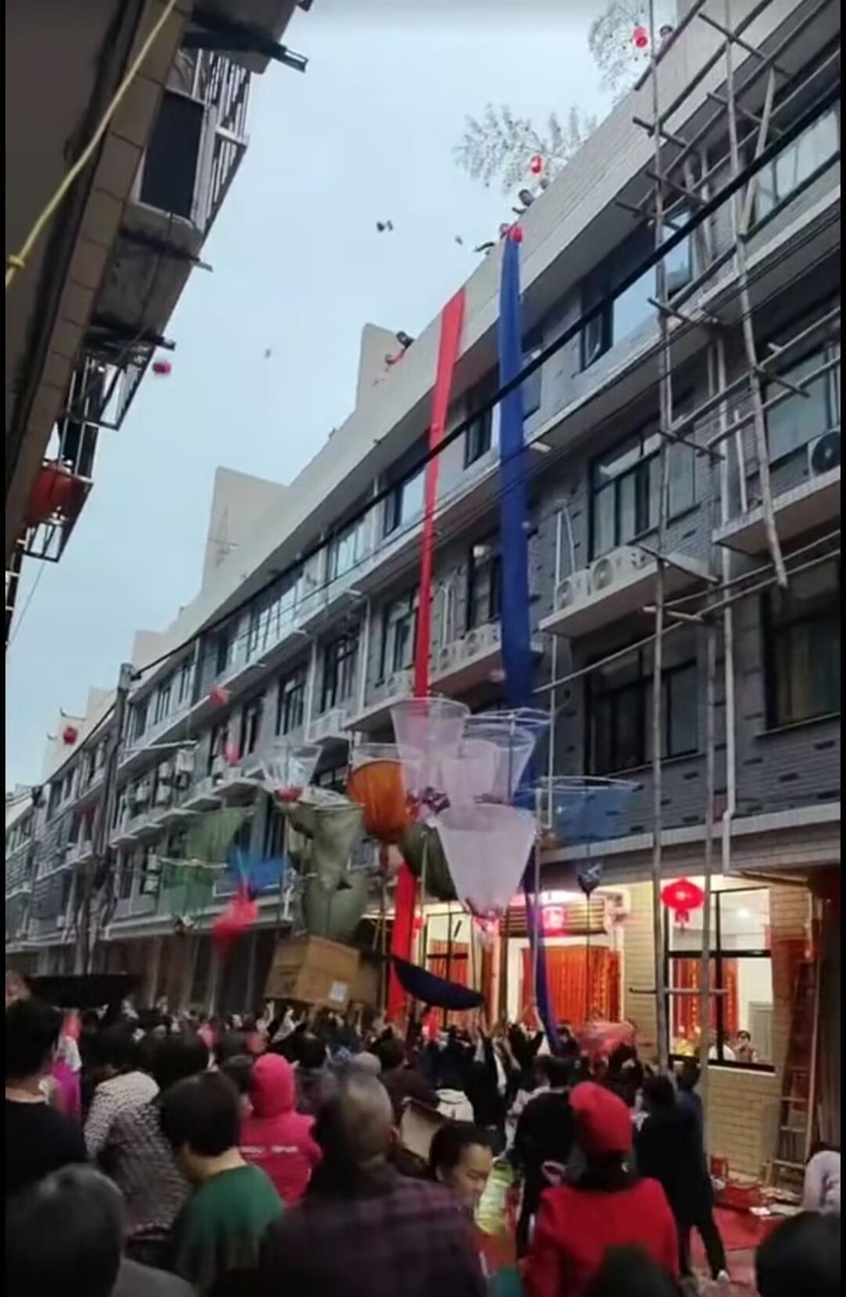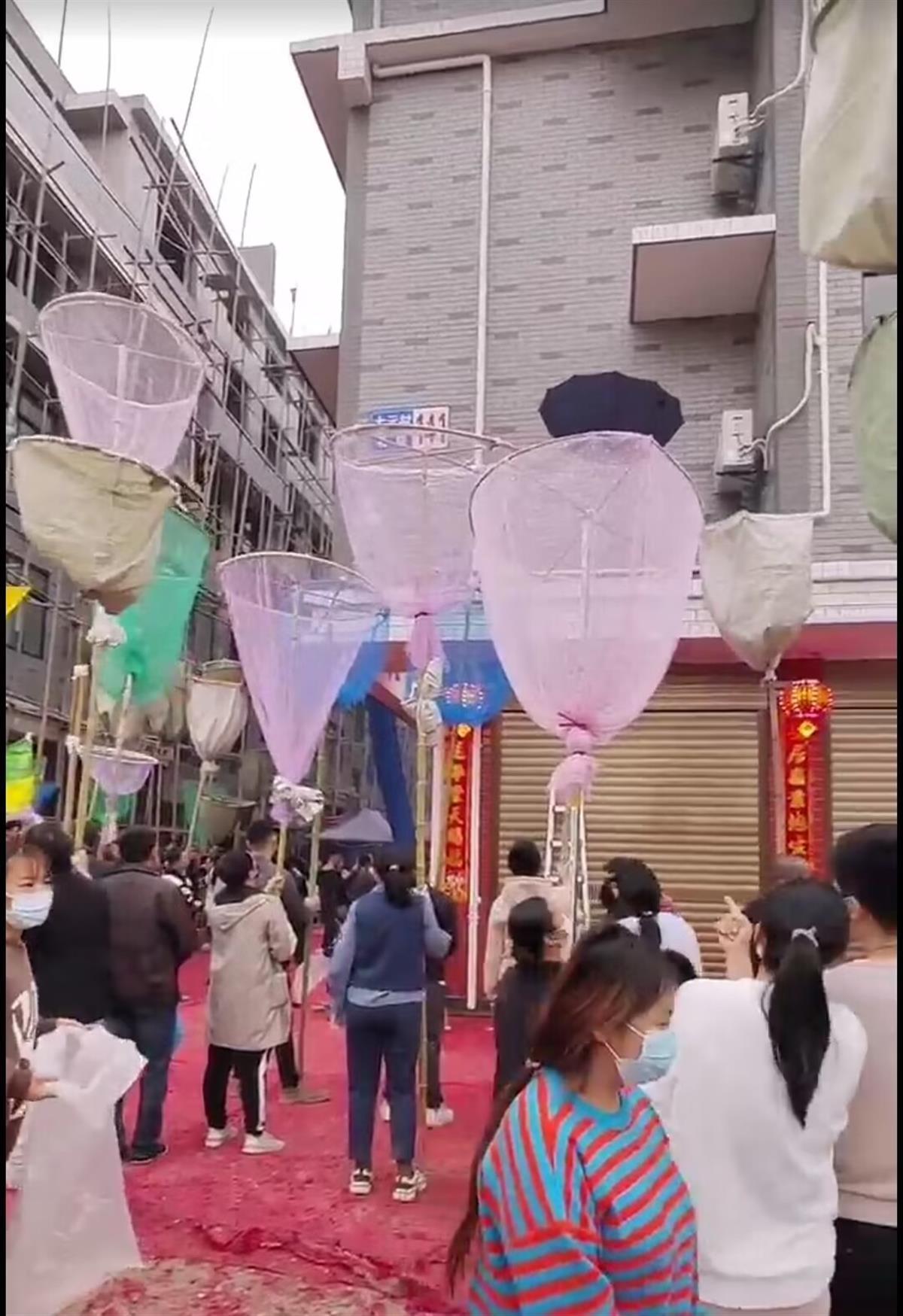 “我一共去了两家,听着有放礼炮的声音就过去看,房主在5层楼高的楼顶往下撒糖果、饼干、用袋子装着的盖红章的馒头等零食,楼下空地上几十人等着捡到这些喜庆的糖果。”李先生说,他是空手去的,但是在现场看到有人拿着用竹竿绑着的网兜,有人将雨伞打开倒着拿,还有人拿着蛇皮袋,目的都是接住从楼上往下撒的糖果等物,现场特别热闹。