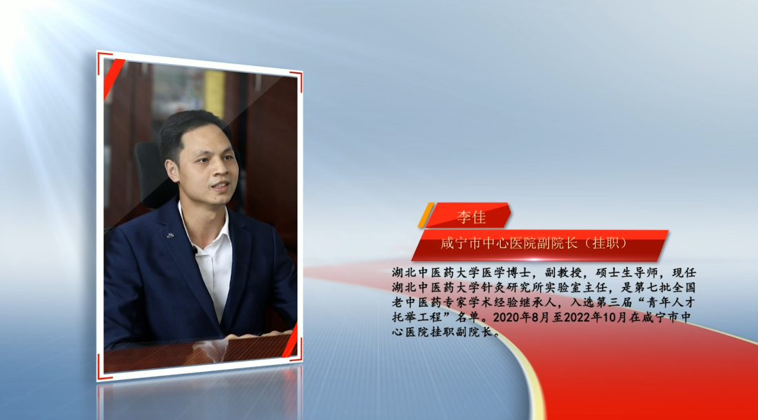 【人物名片】李佳, 湖北中医药大学医学博士,副教授,硕士生导师,现任湖北中医药大学针灸研究所实验室主任,是第七批全国老中医药专家学术经验继承人,入选第三届“青年人才托举工程”名单。2020年8月至2022年10月在咸宁市中心医院挂职副院长。