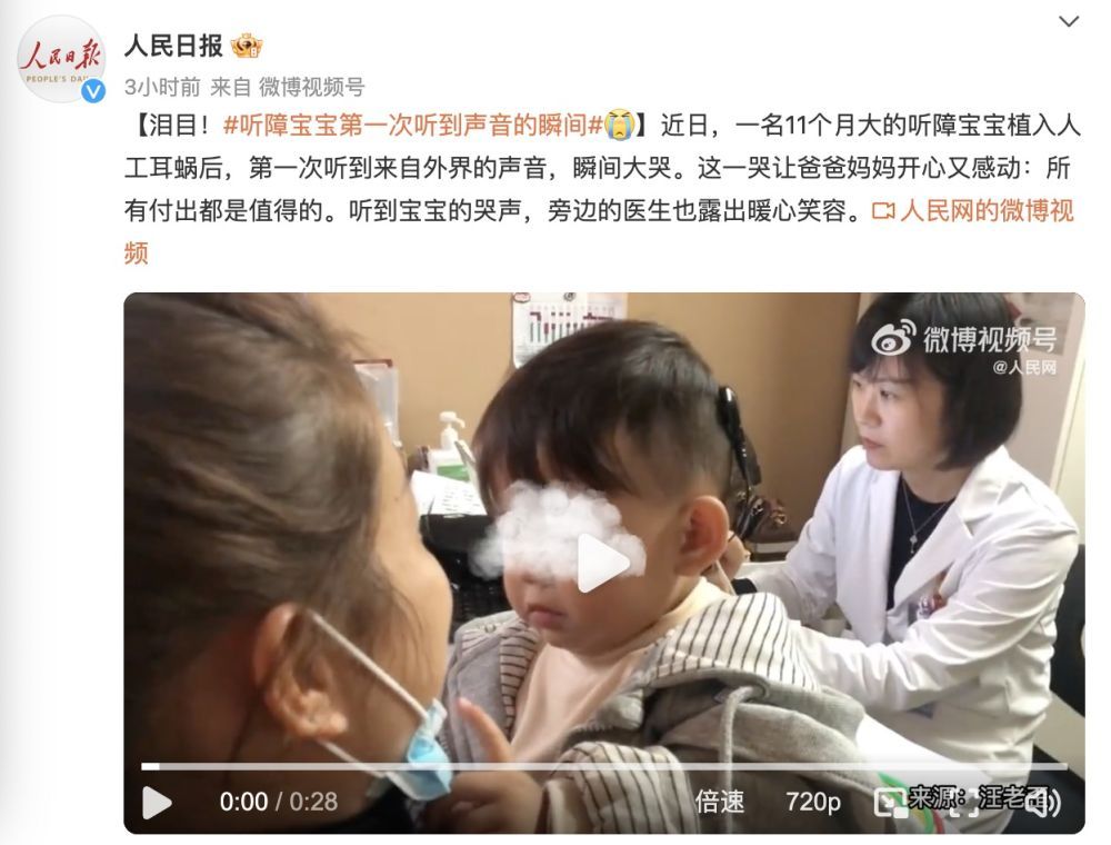 【泪目!听障宝宝第一次听到声音的瞬间】近日,一名11个月大的听障宝宝植入人工耳蜗后,第一次听到来自外界的声音,瞬间大哭。这一哭让爸爸妈妈开心又感动:所有付出都是值得的。听到宝宝的哭声,旁边的医生也露出暖心笑容。